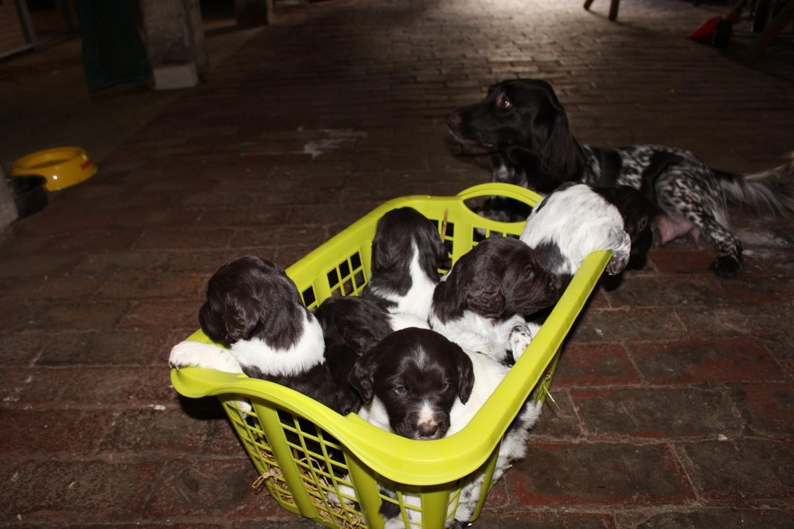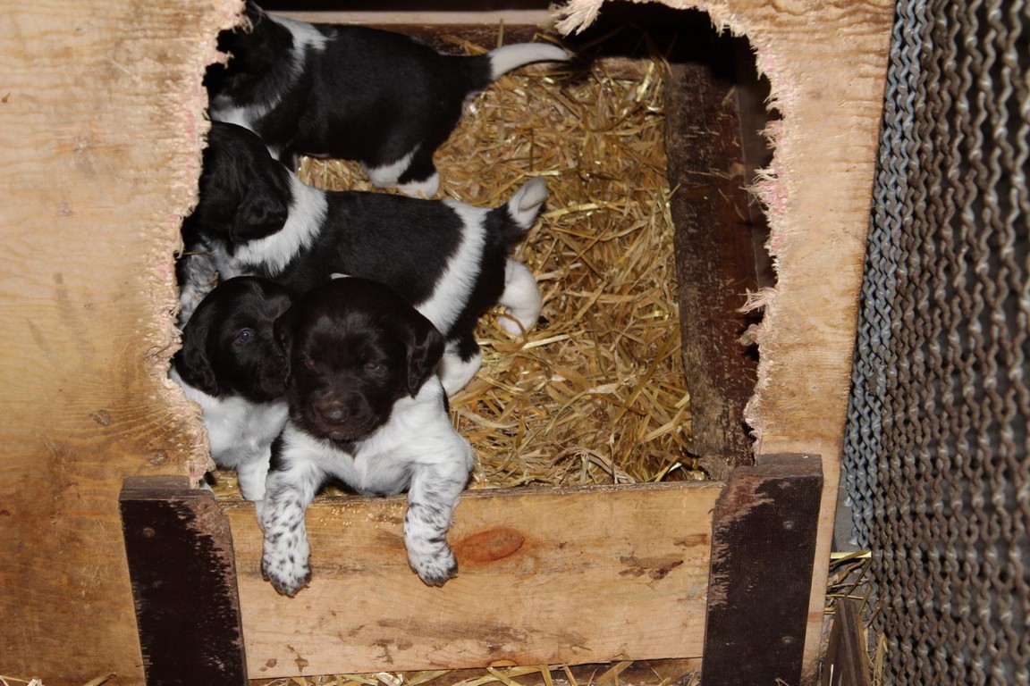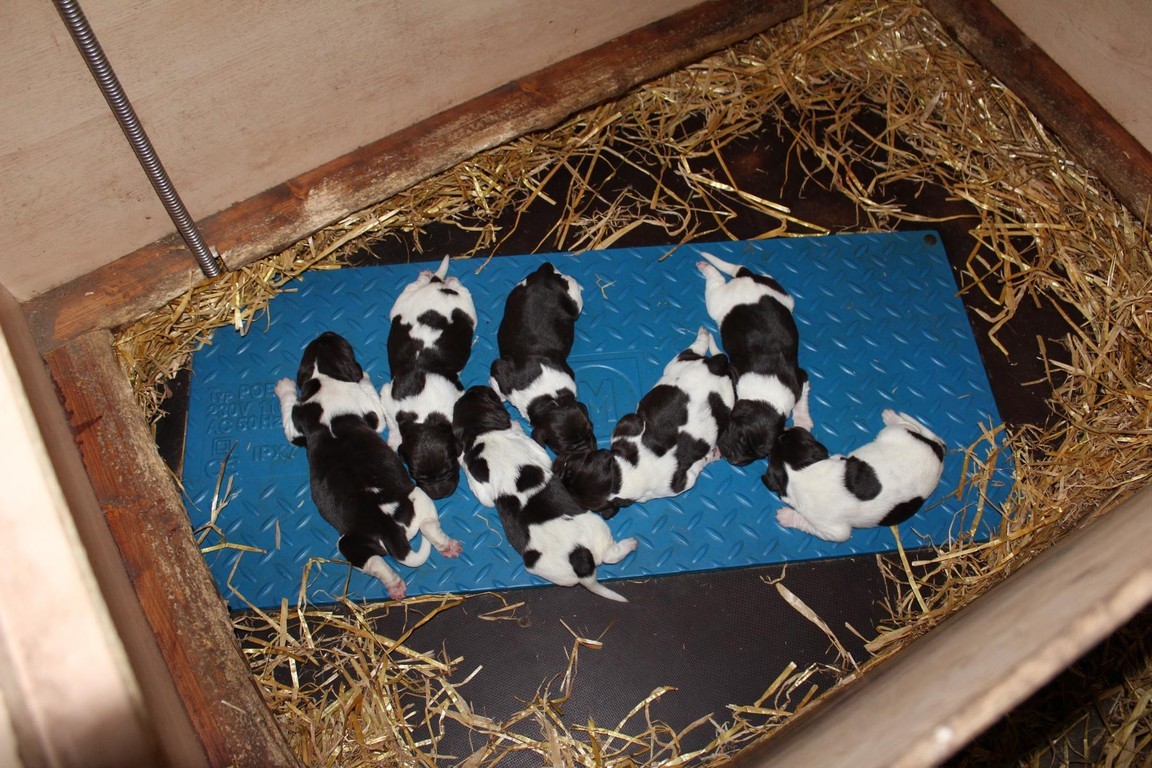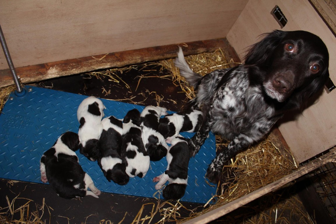 Pinka hat heute morgen so gut wie garnichts gefressen . War sehr viel am Hecheln und hat immer wieder im Stroh gekrasst. Am Abend gegen 17.00 Uhr war es dann soweit , der erste Welpe erblickte das Licht der Welt. Laut Ultaschall sollten es min. 7 Welpen sein , also hieß es warten. Gegen 22 Uhr konnten wir sicher sagen , das war es jetzt . 7 keine Münsterländer sind jetzt da. Alle wohl auf und kugelrund. Ein sehr guter Start.